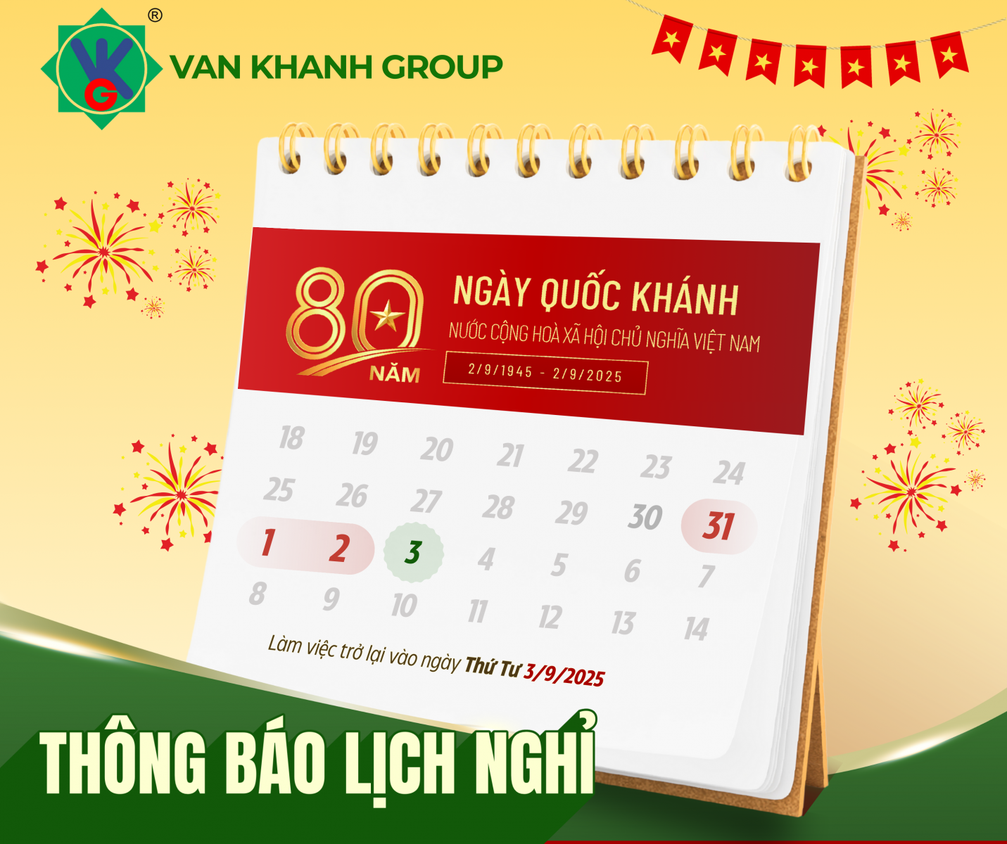 Thời gian nghỉ lễ: từ ngày 31/08/2025 đến hết ngày 02/09/2025